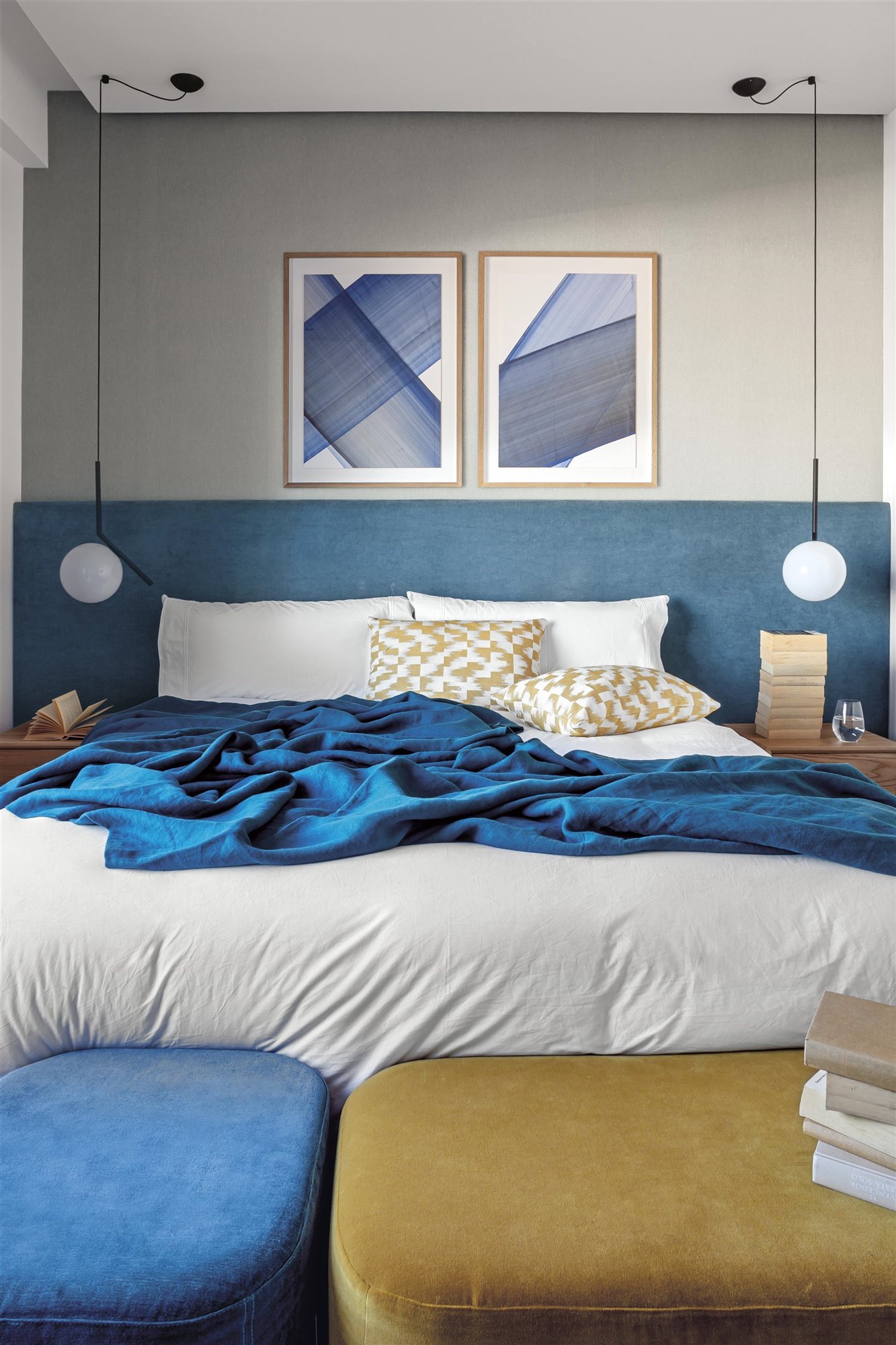 Recently, Luis Miguel Rico, Lucía Gorostegui and Daniel Nuñez were highlighted in Arquitectura y Diseño, an architecture and interior design magazine. The works of these three artists were carefully selected to be featured in an apartment designed by Galan Sobrini Arquitectos. The apartment overlooks the well known and loved Retiro Park in Madrid, and the goal of the design was to improve the flow of natural light in the space and better suit the client’s lifestyle. They aimed for a clean and timeless style, and the inclusion of works by Luis Miguel Rico, Lucía Gorostegui and Daniel Nuñez align with this mission perfectly. One of Luis Miguel Rico’s paintings from the Onyx A3 series was placed above the headboard of the modern blue, white and yellow bedroom, while Esencia #3 from the Essentials Series at Casa Ola by Gorostegui and Dust Painting by Cecilia Sebastián de Erice are displayed in other spaces of the home.