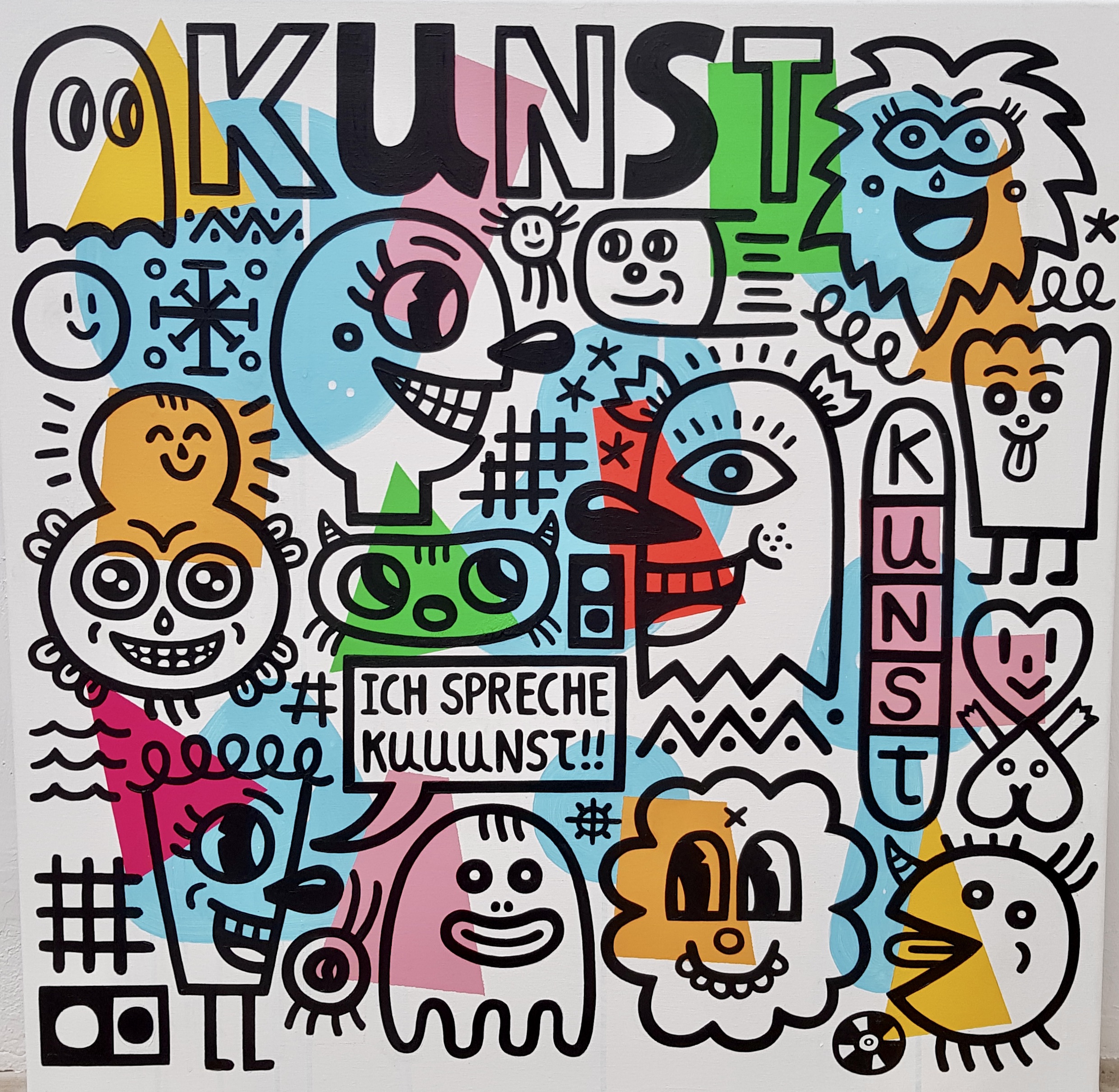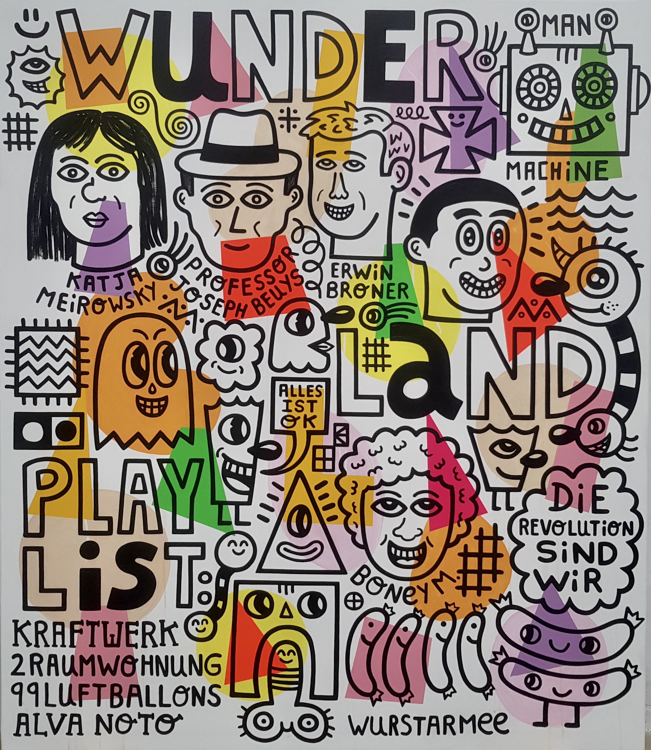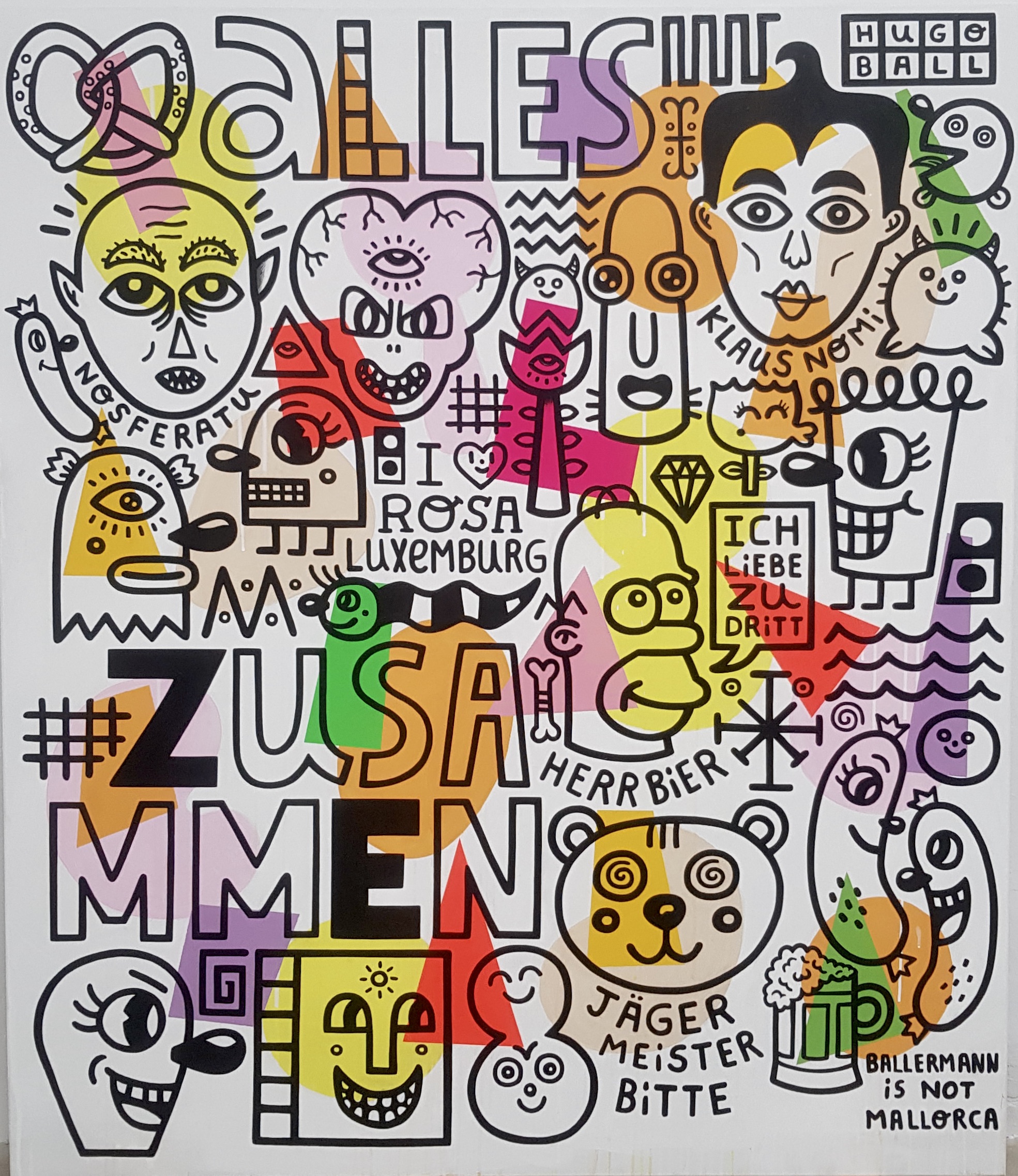 Albert Pinya (1985, Palma de Mallorca) bases his work on a deliberate and ironic ingenuity that dismantles the perverse structures of reality. He has quickly developed an identifiable style of his own, in which he applies the codes of popular culture, comics, illustration and a thoughtful naive aesthetic that hides the precise treatment of the themes he explores. His work rejects “l’art pour l’art” and understands that, being a means of expression, art is eminently communicative and must always be based on an ideology. For all this, rather than talking about ‘artistic creation’ we would have to talk about ‘artistic reaction’. Painting, drawing, intervention, installation, performance, graphic work and sound are the means with which he develops the discourse of the narratives. One of his greatest obsessions focuses on the study and observation of human beings and the way they establish relationships with society and with the environment.