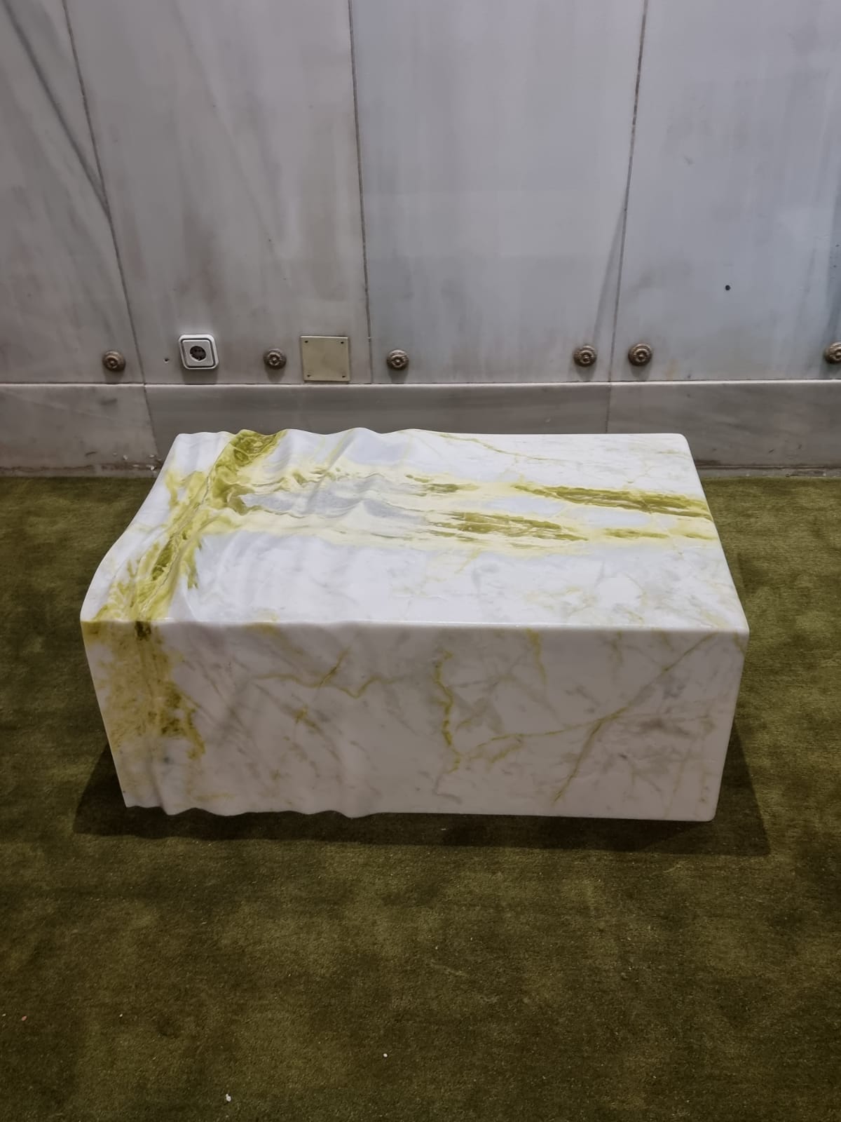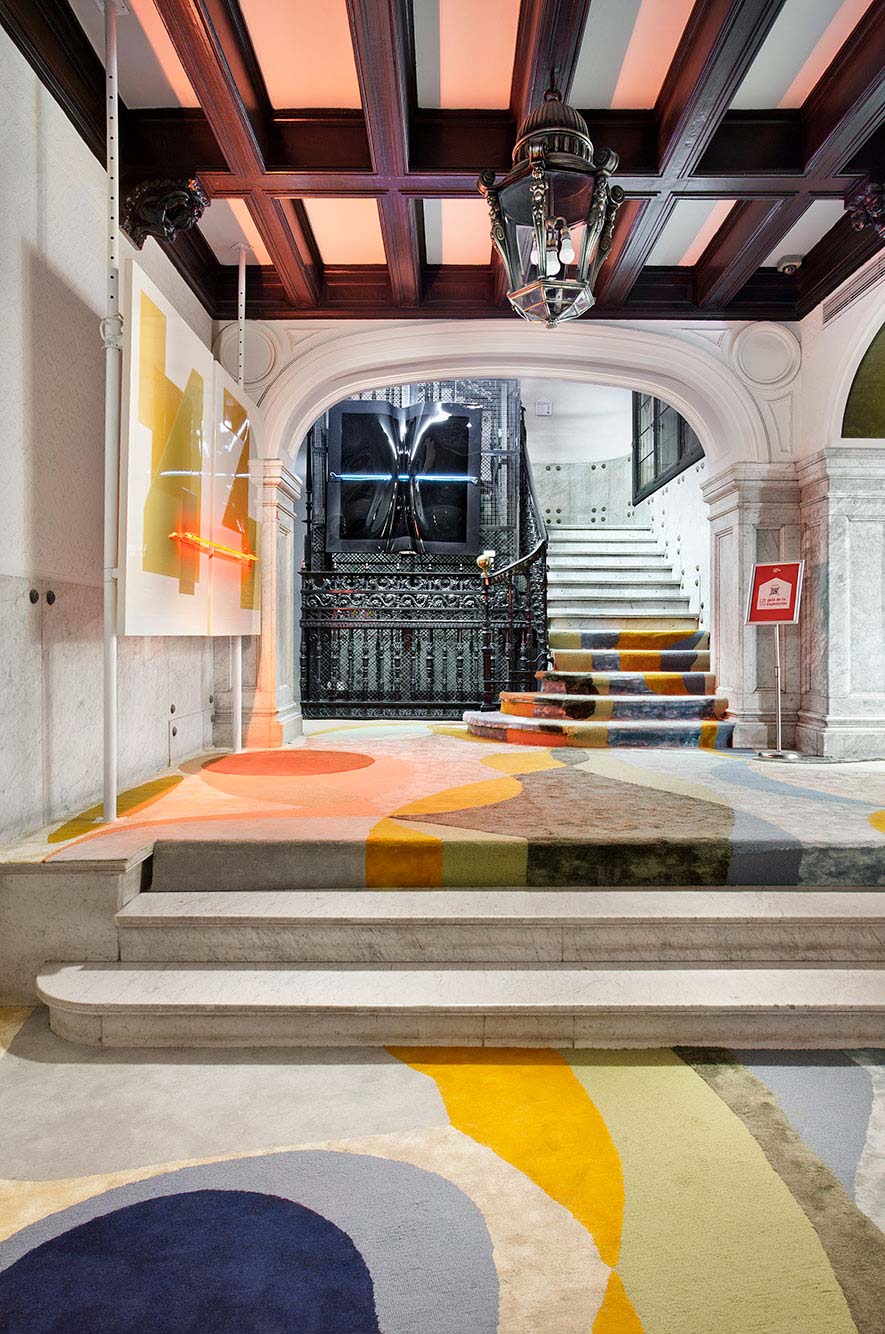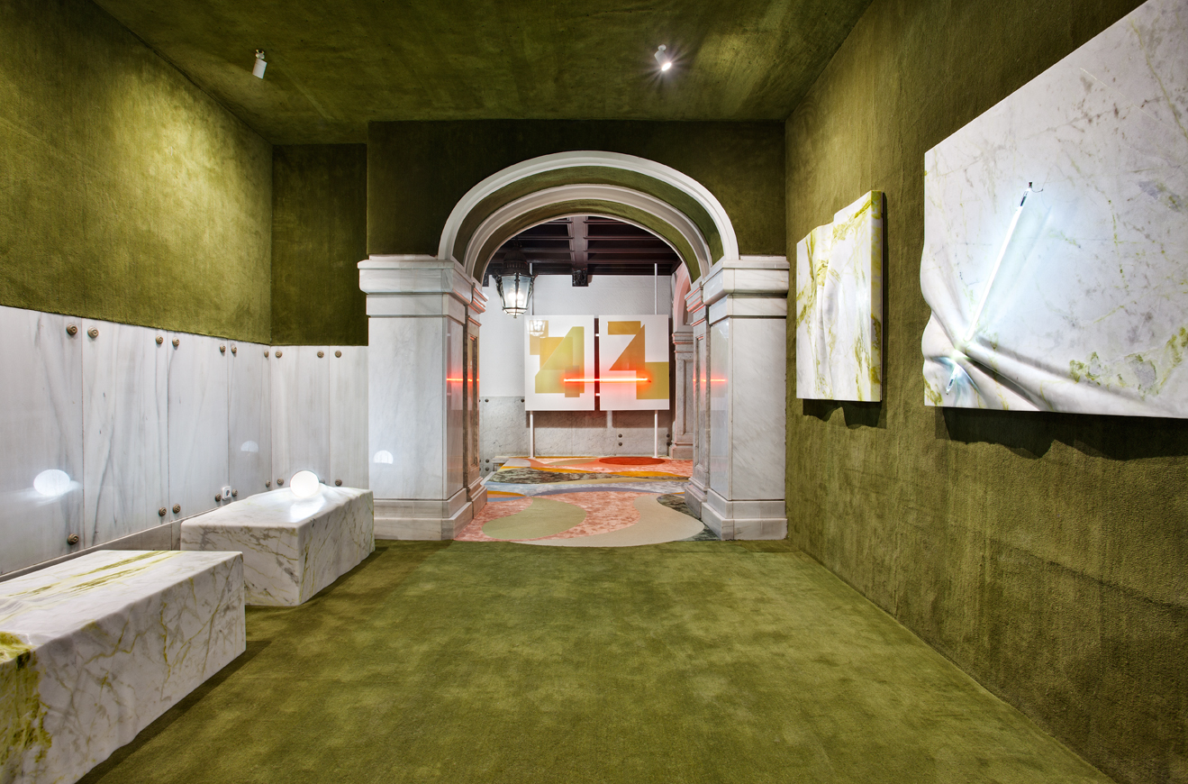 A wool and silk rug handmade in India, mirror effect laminates, resin and neon artwork by Fernando de Ana, and wall sculptures and furniture in natural stone designed by Enrique García in collaboration with Fernando.