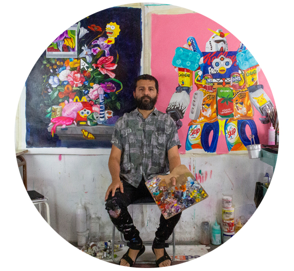The figures that populate her works oscillate between beauty and ugliness, they have a cartoonish appearance that adds a glimpse of humor and playfulness to her compositions, yet they are imbued with philosophical subtleties. Hosseini’s paintings take us to a dreamlike world where each of her characters evokes our unconscious thoughts, our inner child, as well as our mental and social imagery.