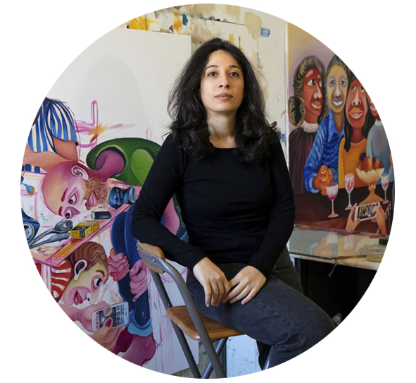 trained under Austrian abstract artists including Christian Schwarzwald and Gunter Damisch, Reihaneh soon returned to figurative painting, her favored style for reflecting on the world that surrounds her. As a storyteller, she is inspired by her friends and her everyday life experiences, yet she portrays them with a dysmorphic rendition, exaggerated proportions, grotesque, and distorted features, and an incongruous palette. Her strong sense of corporeality coupled with the absurdity of the scenes that she depicts reveal a psycho-emotional approach to life and painting.