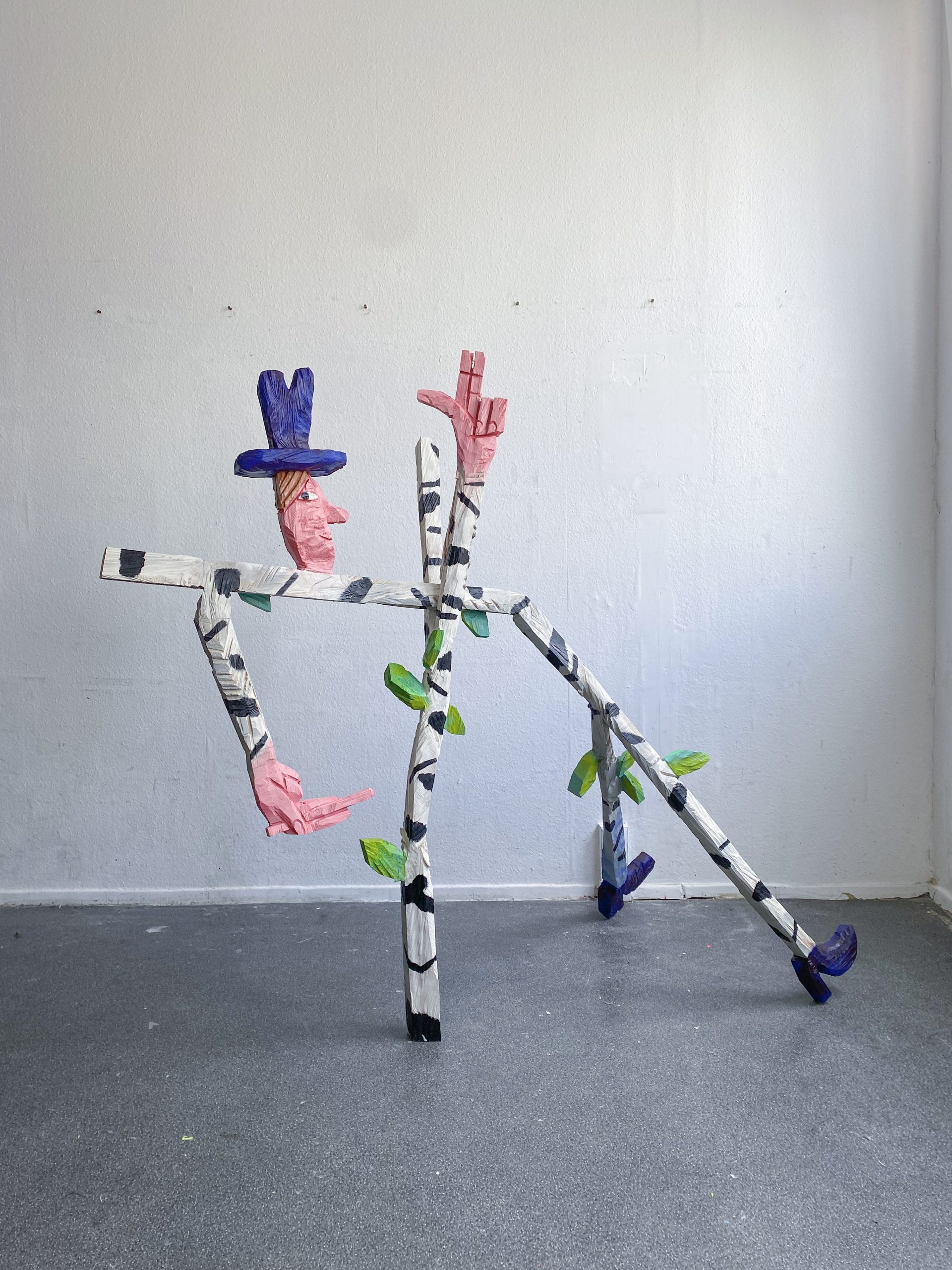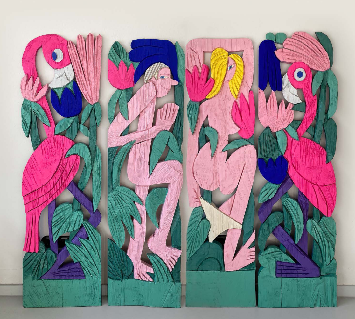 Oil grants my paintings flexibility and allows me to depict objects with exactly the level of detail I need. For wooden sculptures, on the contrary, I rely on my trusted chainsaw in order to juxtapose that roughness to the elegance of canvas. This is my strategy to achieve simultaneously a sense of tension and balance. I tend to work in series, developing certain topics or themes that reach me in the process of daily meditation.