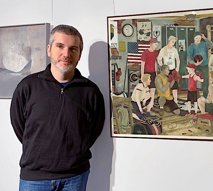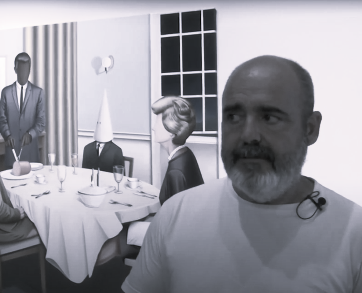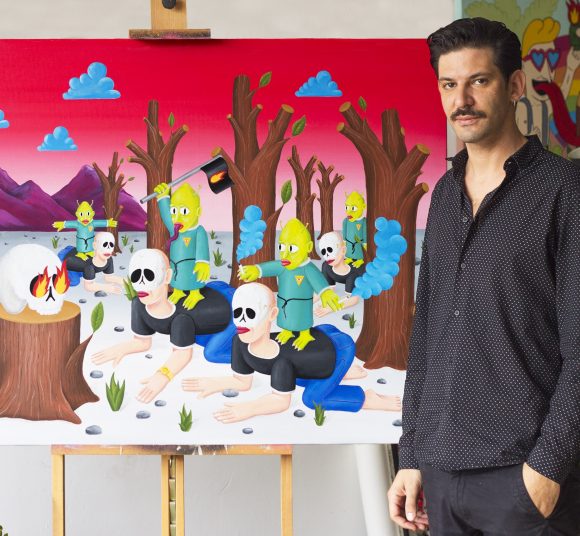 His work is influenced by the world of comics, where the artist places the individual in interaction with others, mixed with backgrounds of powerful colours, as the central axis of his works.