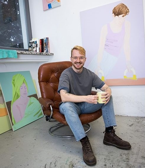 Moritz, born in Munich in 1991, is a young artist known for his figurative aesthetics and use of personal photographs, archive images, and screenshots as reference material. He graduated from the Academy of Fine Arts in Munich in 2021 and has been exhibiting for over six years with increasing success. Moritz's unique combination of two- and three-dimensionality contemporizes the portrait genre, challenging the viewer's perception of still life versus traditional portraiture. His ability to elevate everyday activities with a soft pastel colour palette sets his work apart from other portraitists.